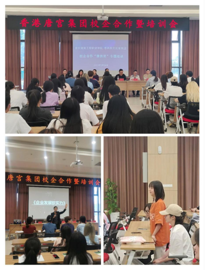 建設(shè)管理學(xué)院院長楊旗在會議上首先歡迎香港唐宮飲食集團一行的到來,感謝企業(yè)長期支持重視校企合作和人才培養(yǎng),希望通過校企合作的方式,提高學(xué)生的實踐能力,實現(xiàn)校企資源的有機結(jié)合和優(yōu)化配置,共同培養(yǎng)經(jīng)濟社會發(fā)展的人才。唐宮集團人力資源總監(jiān)王作春感謝學(xué)院對校企合作的大力支持,并期待開展更深度合作。并向同學(xué)們介紹了唐宮集團的基本情況以及大學(xué)生在唐宮集團的職業(yè)生涯規(guī)劃。隨后,現(xiàn)場師生一起觀看了唐宮企業(yè)視頻和學(xué)姐、學(xué)長在唐宮視頻。最后,唐宮集團培訓(xùn)經(jīng)理龐振英以《企業(yè)發(fā)展軟實習(xí)》為題從拓展經(jīng)營、人才培養(yǎng)、文化素養(yǎng)3個方面進行了課程專題培訓(xùn)。培訓(xùn)現(xiàn)場輕松愉悅,同學(xué)們積極參與,在互動中增長知識。