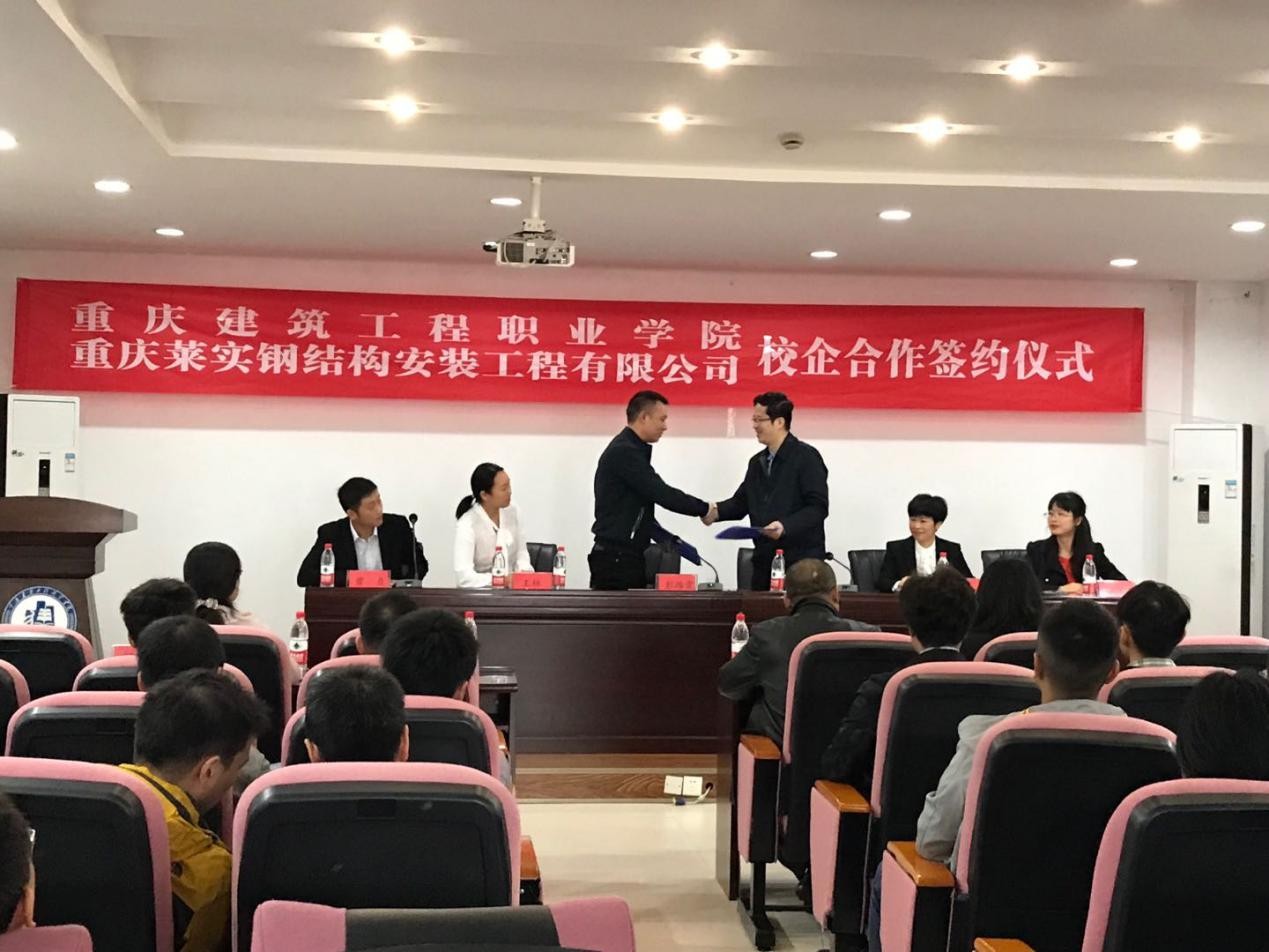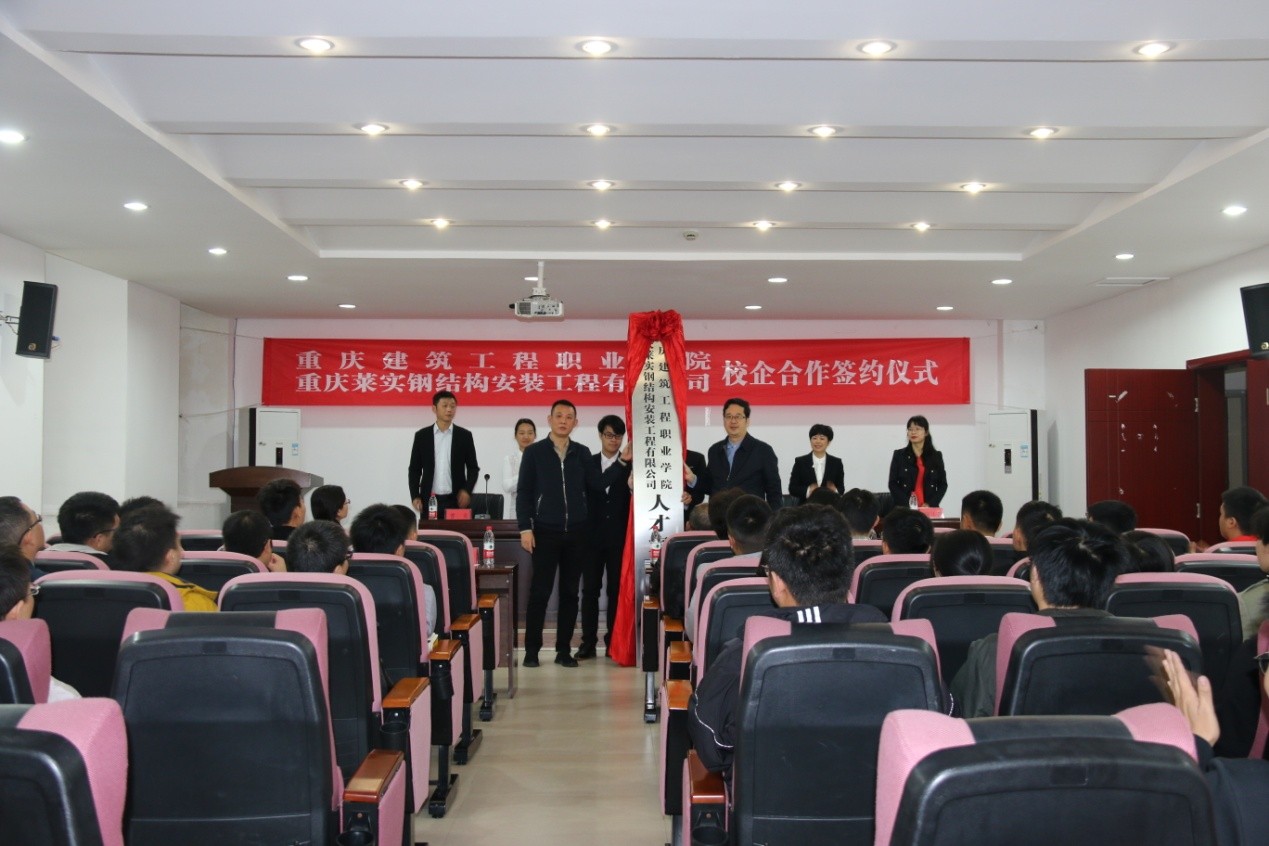 劉院長與萊實(shí)鋼結(jié)構(gòu)總經(jīng)理彭路雲(yún)隨后簽訂了校企合作協(xié)議書,并為“重慶萊實(shí)鋼結(jié)構(gòu)安裝工程有限公司人才定點(diǎn)培養(yǎng)基地”揭牌。隨后舉行了“萊實(shí)鋼構(gòu)班”授牌儀式。
