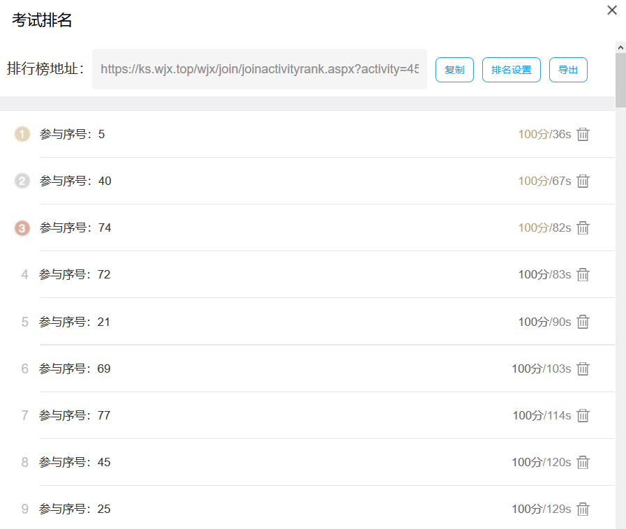 學(xué)生參加線上知識答題成績一覽