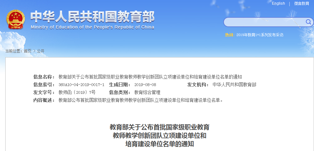 近日,教育部發(fā)布了《關(guān)于公布首批國家級職業(yè)教育教師教學(xué)創(chuàng)新團(tuán)隊(duì)立項(xiàng)建設(shè)單位和培養(yǎng)建設(shè)單位名單的通知》,正式公布了首批入選的院校名單,我院成功入選國家級立項(xiàng)建設(shè)單位。
