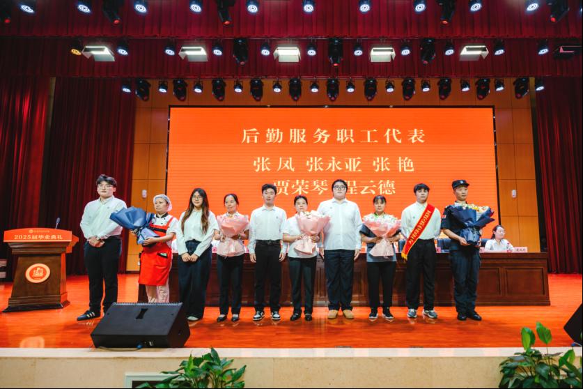 畢業(yè)生代表向教職工代表和后勤服務員工代表獻上鮮花,表達對三年來辛勤付出的師長和工作人員的誠摯謝意。