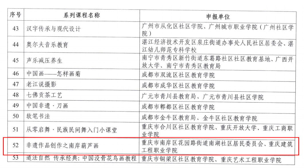 近日,教育部辦公廳發(fā)布《關(guān)于推介2024年縣域社區(qū)學(xué)習(xí)中心典型案例和品牌課程的通知》,財經(jīng)商貿(mào)學(xué)院李靜教授與重慶市南岸區(qū)花園路街道南湖社區(qū)居民委員會聯(lián)合主持建設(shè)的《非遺作品創(chuàng)作之南岸葫蘆畫》,成功入選2024年縣域社區(qū)學(xué)習(xí)中心品牌課程。該課程以校社協(xié)同模式,聯(lián)合非遺傳承人開展教學(xué),通過線上線下結(jié)合的方式傳承葫蘆畫藝術(shù),深受社區(qū)居民認(rèn)可。