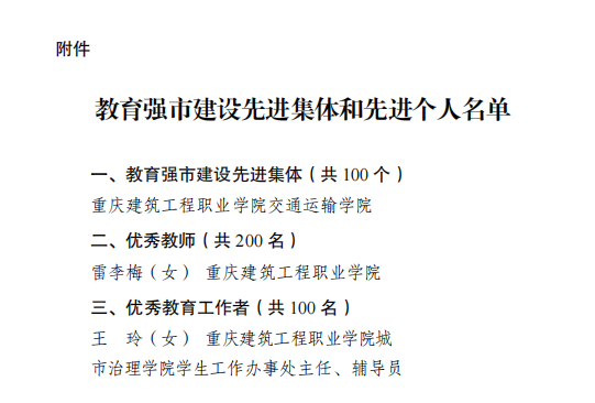 9月22日,重慶市人力資源和社會(huì)保障局、重慶市教育委員會(huì)聯(lián)合下發(fā)《關(guān)于表彰教育強(qiáng)市建設(shè)先進(jìn)集體和先進(jìn)個(gè)人的決定》(渝人社〔2025〕443號(hào)),我校交通運(yùn)輸學(xué)院榮獲“教育強(qiáng)市先進(jìn)集體”榮譽(yù)稱號(hào),智能建造學(xué)院雷李梅老師榮獲“優(yōu)秀教師”榮譽(yù)稱號(hào),城市治理學(xué)院王玲老師榮獲“優(yōu)秀教育工作者”稱號(hào)。