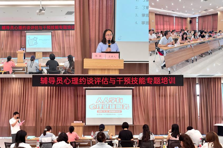10月10日下午,學(xué)校在學(xué)術(shù)報告廳開展了輔導(dǎo)員心理約談評估與干預(yù)技能專題培訓(xùn),旨在加強輔導(dǎo)員開展學(xué)生心理健康工作的專業(yè)性與科學(xué)性,夯實我校心理育人基礎(chǔ)。培訓(xùn)特邀重慶郵電大學(xué)心理發(fā)展指導(dǎo)中心副主任陳敏教授擔(dān)任主講,新進輔導(dǎo)員、班主任和全體專兼職心理輔導(dǎo)老師參加。陳教授結(jié)合我校輔導(dǎo)員在實際工作中遇到的典型問題,深入淺出地講解談心談話技巧、心理評估方法及干預(yù)策略,幫助參訓(xùn)老師掌握更具操作性的心理輔導(dǎo)技能。