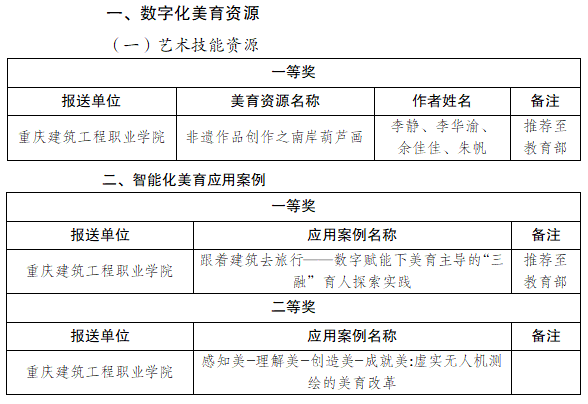 近日,重慶市教育委員會公布2025年度數(shù)字化美育資源和智能化美育應(yīng)用案例遴選結(jié)果,我校推報的3項作品憑借鮮明的專業(yè)特色和扎實(shí)的育人成效全部獲獎。其中數(shù)字化美育資源(藝術(shù)技能資源類)一等獎1項,智能化美育應(yīng)用案例一等獎1項、二等獎1項。財經(jīng)商貿(mào)學(xué)院《非遺作品創(chuàng)作之南岸葫蘆畫》、數(shù)字設(shè)計學(xué)院《跟著建筑去旅行——數(shù)字賦能下美育主導(dǎo)的“三融”育人探索實(shí)踐》2項作品被推薦至教育部參加評選,充分彰顯了我校美育工作的育人成果和創(chuàng)新活力。
