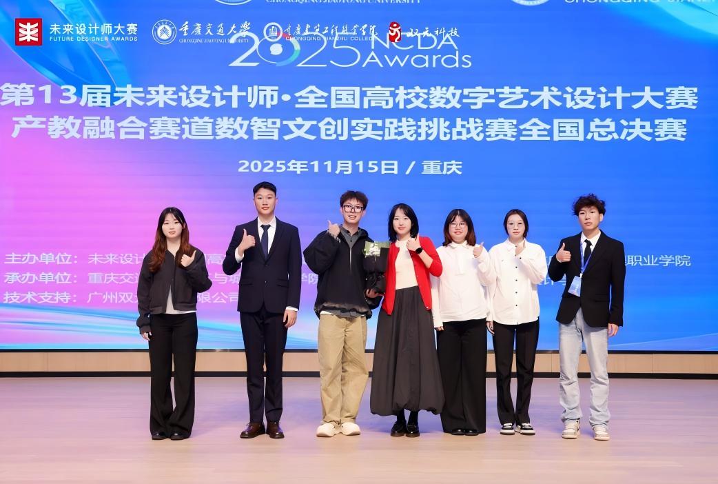我校參賽隊師生再2025數(shù)智文創(chuàng)挑戰(zhàn)賽頒獎儀式上合影