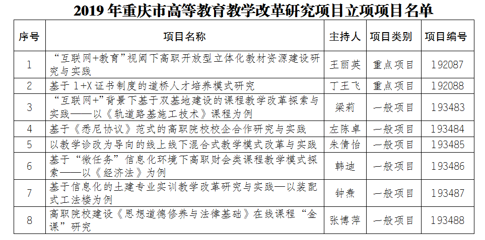 近日,重慶市教育委員會公布了2019年高等教育教學(xué)改革研究項目立項結(jié)果,我院推薦申報的8個項目全部獲批立項,其中重點項目2項,一般項目6項。
