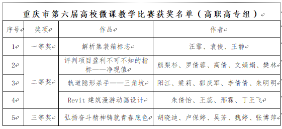 本次微課比賽分兩個階段進行。院內(nèi)初賽由教務(wù)處組織進行,決賽由重慶市教育委員會組織開展。經(jīng)過院內(nèi)初賽階段的精心評選,從眾多優(yōu)秀作品中推薦6個作品代表學(xué)院參賽。各位參賽老師積極準備素材、精心設(shè)計教學(xué)環(huán)節(jié),高標準高質(zhì)量地完成了微課作品,最終喜獲佳績。