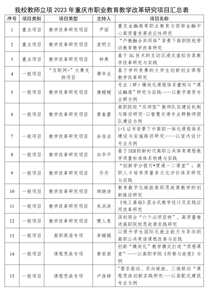 近日,重慶市教育委員會(huì)發(fā)布了《關(guān)于公布2023年職業(yè)教育教學(xué)改革研究項(xiàng)目評(píng)選結(jié)果的通知》(渝教職成函〔2023〕93號(hào)),我校《重慶金融高等職業(yè)教育與西部金融中心高質(zhì)量發(fā)展適應(yīng)性研究》等15個(gè)項(xiàng)目獲批立項(xiàng),其中重點(diǎn)項(xiàng)目3個(gè),一般項(xiàng)目12個(gè)。