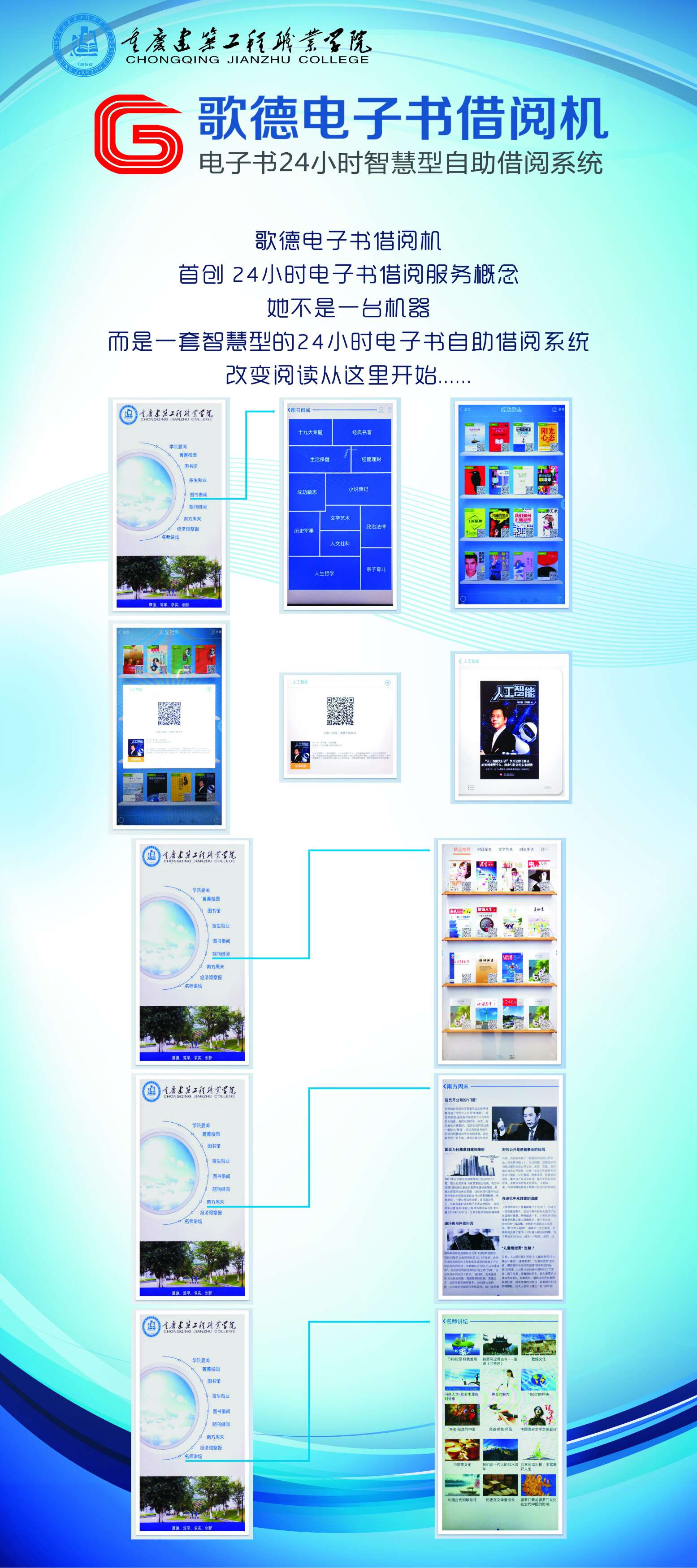 我院電子借閱機(jī)已投放使用,擺放在四號(hào)和五號(hào)教學(xué)樓大廳,歡迎大家使用并提出寶貴意見(jiàn)!該借閱機(jī)可在線瀏覽最新的學(xué)院要聞、各類期刊,也可利用手機(jī)下載圖書(shū)和期刊到手機(jī)上閱覽。具體包括: