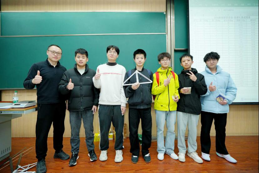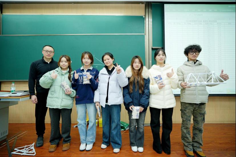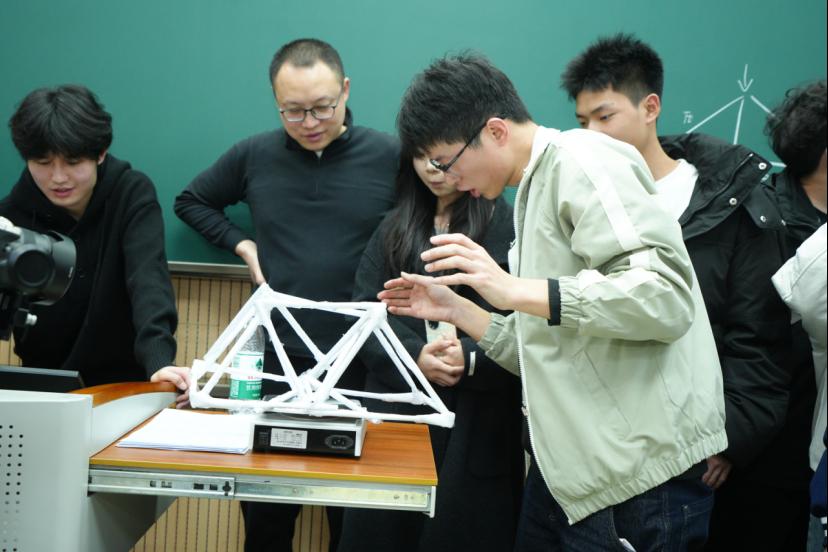 接下來(lái)的手工橋模實(shí)踐將活動(dòng)推向高潮。165名學(xué)生分成27個(gè)小組,在規(guī)定時(shí)間內(nèi)利用提供的材料完成橋梁模型制作。從結(jié)構(gòu)設(shè)計(jì)、材料裁剪到拼接組裝,各小組成員分工明確、密切配合,在實(shí)踐中錘煉動(dòng)手能力與團(tuán)隊(duì)協(xié)作意識(shí)。制作結(jié)束,激動(dòng)人心的模型承重測(cè)試讓同學(xué)們?cè)陉囮嚉g呼聲中檢閱了自己的實(shí)踐成果。這個(gè)環(huán)節(jié)讓同學(xué)們深刻體會(huì)到“紙上得來(lái)終覺淺”,課本上的結(jié)構(gòu)力學(xué)與橋梁承重知識(shí)在實(shí)際操作中才有了更鮮活的意義。