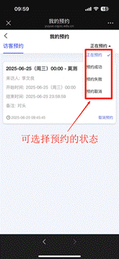 點擊【預(yù)約記錄】可查看“正在預(yù)約”、“預(yù)約成功”、“預(yù)約失敗”、“預(yù)約取消”的信息。