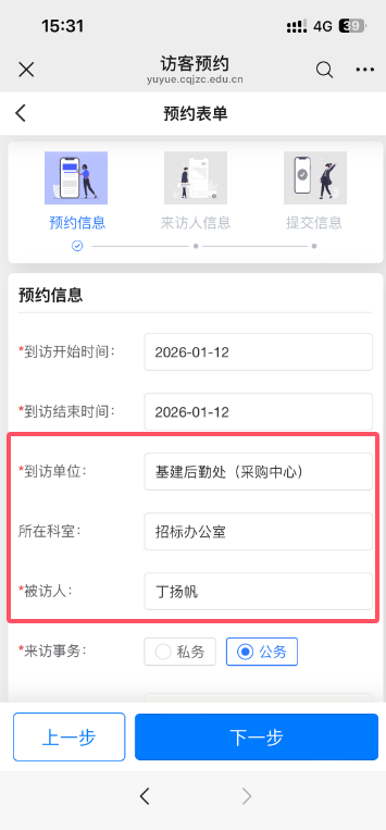填寫預(yù)約表單信息,根據(jù)表單信息依次填寫,其中到訪單位:基建后勤處(采購中心),所在科室:招標(biāo)辦公室(必填,否則無法選到被訪人丁揚帆),被訪人:丁揚帆,來訪事務(wù):公務(wù),來訪事由:據(jù)實填寫。