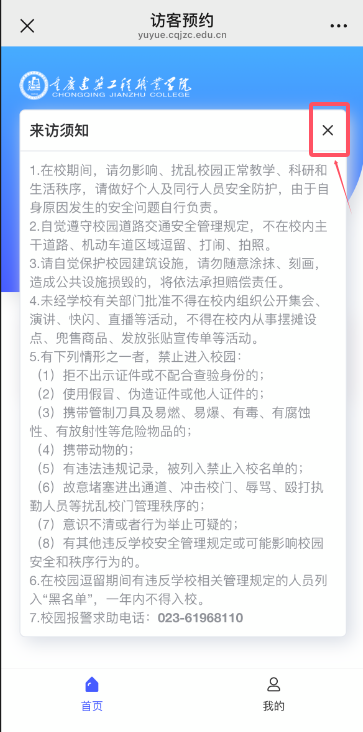 閱讀【來訪須知】后點X關(guān)閉,點擊【訪客預(yù)約】進(jìn)入預(yù)約信息頁,填寫必填信息: