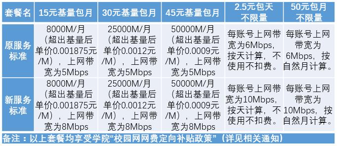 為滿足各用戶對手機疊加校園網(wǎng)融合使用的需求,以及對通過校園網(wǎng)訪問互聯(lián)網(wǎng)高速度的需求,經(jīng)學(xué)院研究決定,調(diào)整校園網(wǎng)網(wǎng)絡(luò)資費內(nèi)容,具體如下: