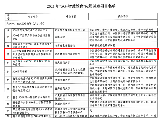 近日,工信部、教育部公布了109個(gè)2021年“5G+智慧教育”應(yīng)用試點(diǎn)項(xiàng)目名單,由我校牽頭申報(bào)的“5G數(shù)智賦能智能建造與信息技術(shù)類專業(yè)虛擬仿真實(shí)訓(xùn)多場(chǎng)景教學(xué)應(yīng)用平臺(tái)研究”項(xiàng)目成功入選,成為僅有的兩個(gè)由職業(yè)院校牽頭試點(diǎn)的項(xiàng)目之一,這也是我校獲批的首個(gè)國家級(jí)教育信息化試點(diǎn)項(xiàng)目。