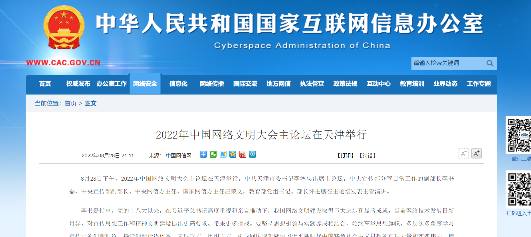 8月28日下午,2022年中國(guó)網(wǎng)絡(luò)文明大會(huì)主論壇在天津舉行。教育部黨組書記、部長(zhǎng)懷進(jìn)鵬在主論壇發(fā)表主旨演講。