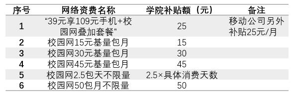 2.補(bǔ)貼對(duì)象:選用學(xué)院任意一款校園網(wǎng)套餐或手機(jī)寬帶融合套餐的在校生。