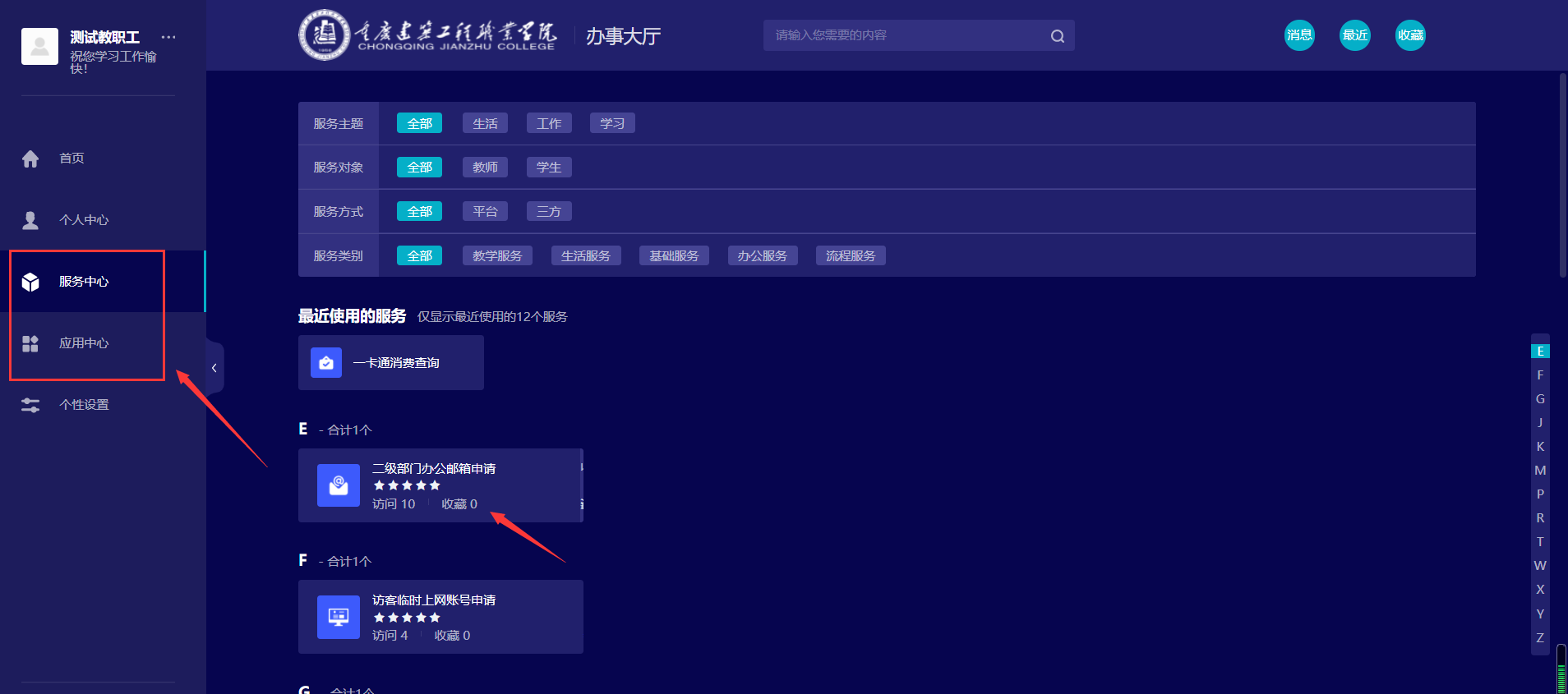 在頂部搜索框中搜索關(guān)鍵字,或者切換到“服務(wù)中心”、“應(yīng)用中心”查找,找到應(yīng)用后點(diǎn)擊“收藏”即可。