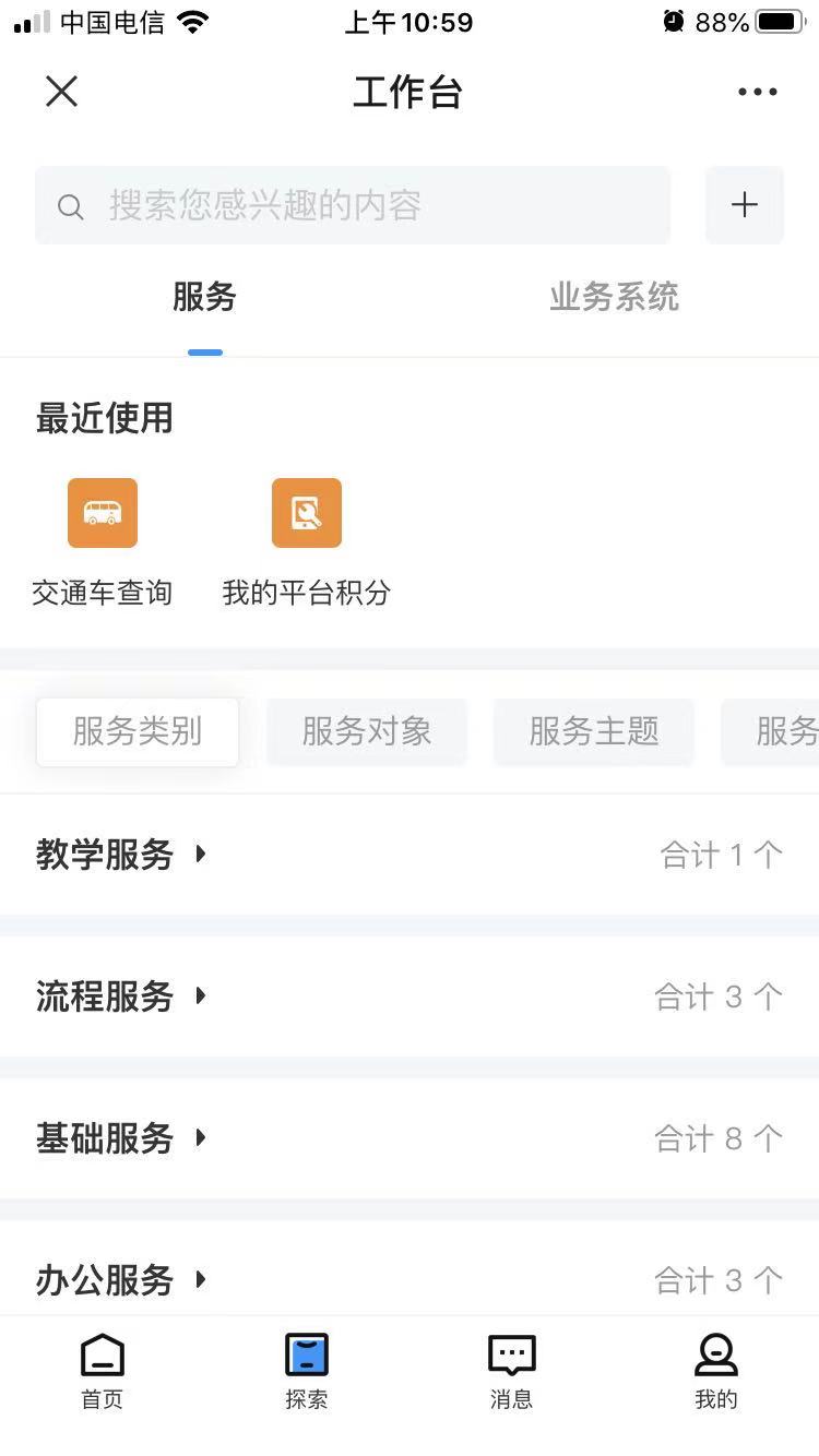 點(diǎn)擊底部探索窗口,這里面包含服務(wù)、業(yè)務(wù)系統(tǒng)、歷史使用記錄及各分類標(biāo)簽