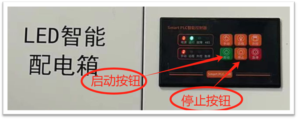 ①進(jìn)入后面設(shè)備間,在配電箱處按下電源“開始”開關(guān)。