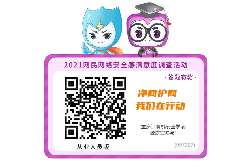 2021年調(diào)查問卷將于8月3日上午9時(shí)正式上線,于8月12日24時(shí)結(jié)束,歷時(shí)10天,屆時(shí)全國(guó)各大網(wǎng)絡(luò)平臺(tái)將同步開通線上采集通道。現(xiàn)誠(chéng)邀全市各重要網(wǎng)絡(luò)運(yùn)營(yíng)單位、網(wǎng)絡(luò)安全服務(wù)機(jī)構(gòu)、重點(diǎn)互聯(lián)網(wǎng)企業(yè)和廣大網(wǎng)民積極參與,以舉手之勞,表達(dá)我們重慶網(wǎng)民關(guān)切,共護(hù)網(wǎng)絡(luò)安全。