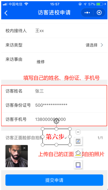 4. 填寫自己的相關(guān)信息,姓名、身份證、聯(lián)系手機(jī),再上傳自己正面臉部照片,最后提交申請即可。