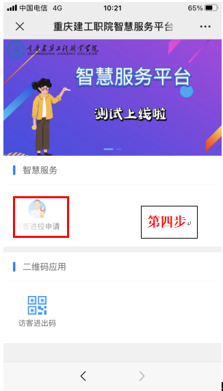 1. 校外人員訪問學(xué)院,通過微信關(guān)注“重慶建工職院智慧服務(wù)”公眾號,點(diǎn)擊“訪客入口”并登陸